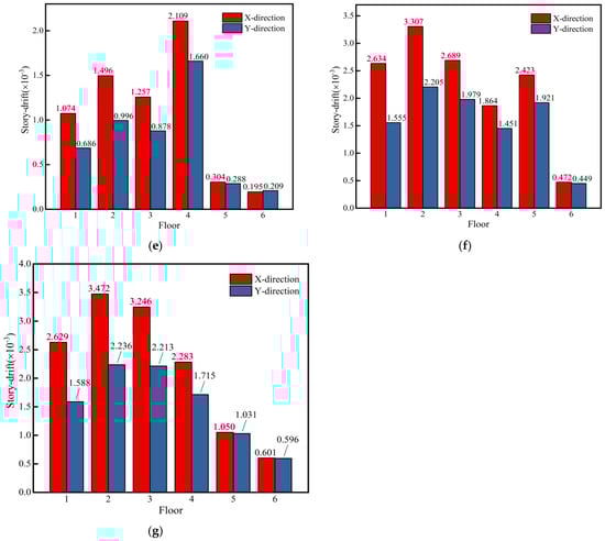 Inter-story drift angles for isolation schemes: (a) base isolation; (b) first-floor isolation; (c) second-floor isolation; (d) third-floor isolation; (e) fourth-floor isolation; (f) fifth-floor isolation; (g) non-isolated structure.