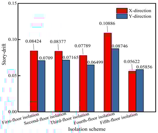 The seismic isolation effects of the six isolation schemes are compared by using the inter-story drift angle as an indicator. The average inter-story drift angles of the building structure under multiple earthquake scenarios for each isolation scheme are shown in Figure 11. It is important to note that a bidirectional horizontal seismic input (X:Y = 1:0.85) was applied during the time-history analysis of the structure. Given the significant differences in the dynamic response of the building structure under different seismic waves, as illustrated in Figure 9, the average inter-story drift angles are discussed herein under the excitation of the four seismic waves (see Section 2). Figure 11 shows that the maximum inter-story drift angles for the base and first- to fifth-floor isolation schemes are 0.0037, 0.0021, 0.0026, 0.0024, 0.0021, and 0.0033 radians, respectively. This indicates that the isolation effect is most effective when the isolation layer is set at the top of the first floor. Additionally, the inter-story drift angles of the isolation layers for each isolation scheme are presented in Figure 12. The maximum drift angles for the isolation layers under the base and first- to fifth-floor isolation schemes are 0.08424, 0.08377, 0.07789, 0.10886, and 0.05856, respectively. Comparing the inter-story drift angles of the isolation layers and those of the structures, it can be observed that with the implementation of the isolation design, the horizontal displacement of the building structure mainly occurs in the isolation layers, with the horizontal displacement of other floors being approximately 1% to 3% of that of the isolation layers.