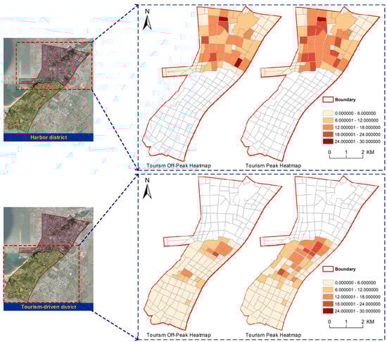 Distribution of tourism vitality in low and high seasons in harbor district and tourism-driven district.