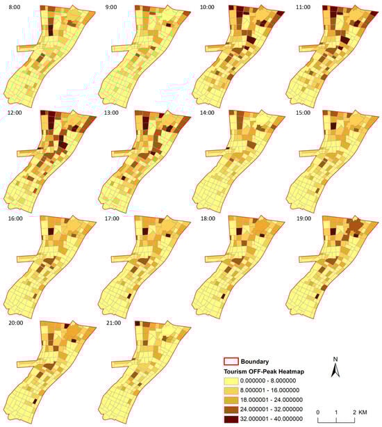 Figure 4 illustrates that during the off-peak tourist season, the spatial vitality of the coastal districts in Bayuquan experienced five stages: a rapid increase, stable maintenance, a sudden decline, a slow rise, and a decrease. Combined with Figure 5 for the spatiotemporal analysis, we gained new insights into people’s activity patterns during the off-peak season in Bayuquan. From 8 to 10 in the morning, which is the time for going out, the spatial vitality of the districts gradually increased, and the number of vitality units grew. The vitality characteristics of the districts continued rising during the morning. However, the vitality values declined after 1 pm after lunch and the rest period. In the afternoon, people’s outdoor activities increased, mainly concentrated in public spaces and commercial areas, leading to a slight decrease in vitality in tourism-driven districts. Although the dynamism of the commercial regions declined after 7 p.m., indicating resting behavior, we can infer a mutual growth and decline pattern in urban spatial vitality. This is related to the functional nature represented by different functional blocks. We also found that the highest and lowest vitality values did not align, suggesting a separation of work and residence in the coastal city of Bayuquan.