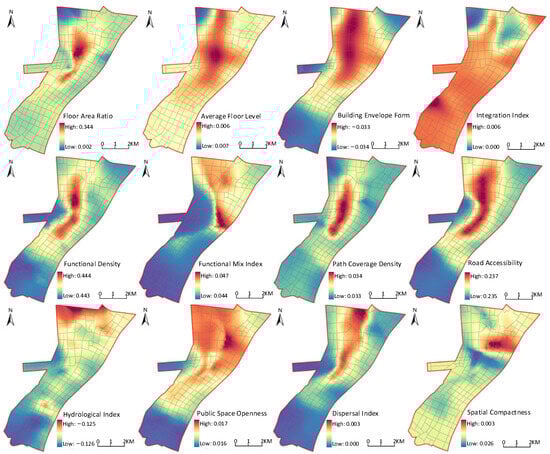 In the formula, corresponds to the vitality value, and to are the 13 explanatory variables that influence the vitality value in this study. They are as follows: block morphology, building volume ratio, average number of floors, building form integration, building form fragmentation, functional density, functional mix, path coverage density, and road accessibility, the hydrological index, public space openness, the dispersal index, and spatial compactness. to are the coefficients of the influencing factors to be estimated; is the constant term; and ε is the error term.