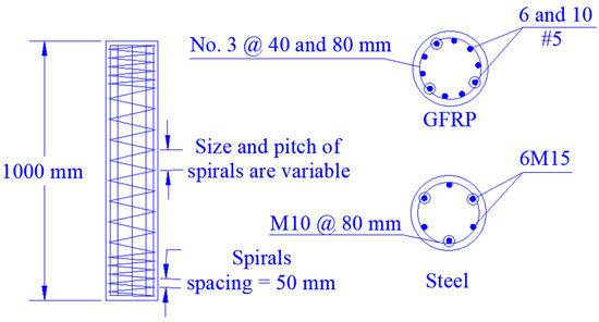 In the current endeavor, a comprehensive study was conducted to evaluate the performance of short reinforced concrete (RC) columns under a concentric compressive axial load. Short concrete columns were chosen to comply with building height restrictions, given the lack of specific design criteria for such columns. Typically located in frame structures, these columns are often found in spaces with restricted vertical clearance, such as beneath mezzanines or within parking garages. This placement optimizes space usage while ensuring adequate structural support. Five full-scale RC columns were cast and tested. Four of these columns were strengthened by integrating GFRP bars and spirals into their structures, while the fifth column was used as a reference and was reinforced using steel bars and spirals. All of the columns had the same dimensions, with a diameter of 250 mm and a total length of 1000 mm, as shown in Figure 1.