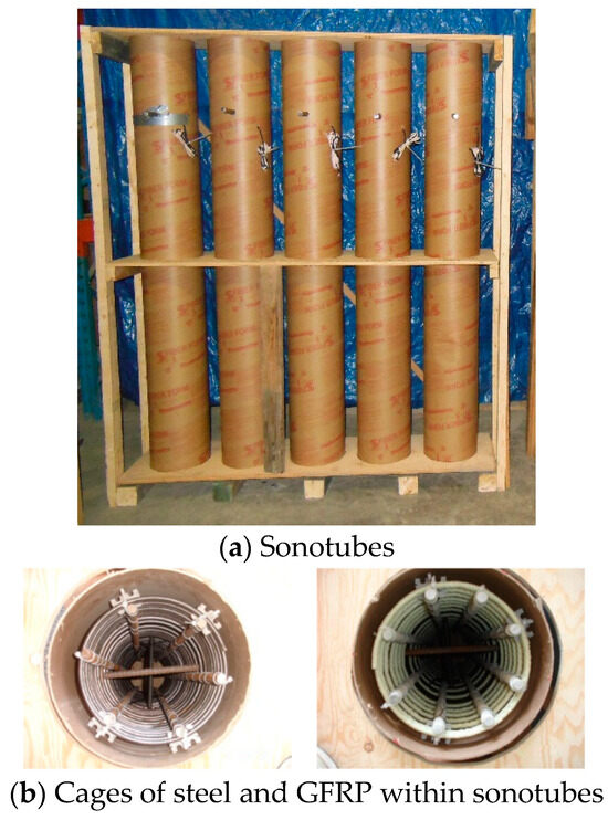 The sand-coated GFRP reinforcement was used to enhance the bond between the bars and surrounding concrete. GFRP longitudinal bars with a size of No. 5 (15.9 mm) were employed in all of the GFRP–RC columns, and, in the perpendicular direction, No. 3 (9.5-mm) GFRP spiral reinforcement was distributed. According to ASTM-D3171 [26], the longitudinal GFRP bars’ tensile characteristics were evaluated, and they are shown in Table 1. By incorporating sand-coated GFRP bars and spirals into the GFRP–RC columns, this study aimed to better understand the mechanical properties of this composite material and its feasibility for use in columns.