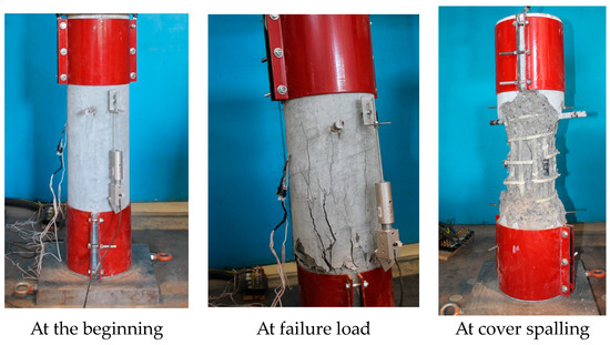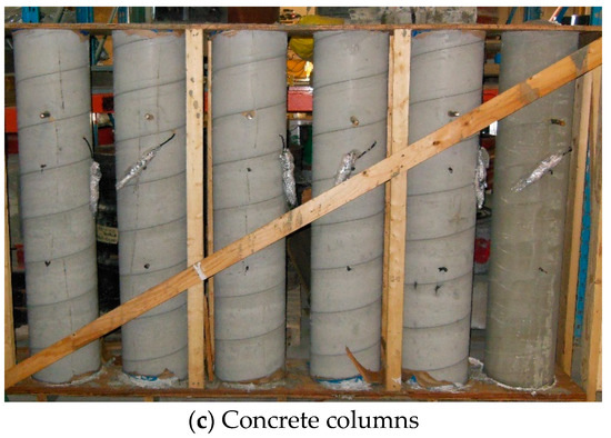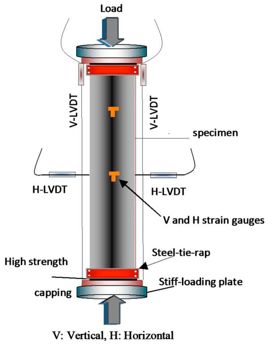 To ensure that the applied load was distributed evenly across the columns’ entire cross-sections, before testing, a thin layer of high-strength cement grout was applied to both ends of the columns. This step was crucial in achieving accurate and reliable results, as it prevented any local failure and ensured that the columns were loaded uniformly. Additionally, steel collars were used to externally confine the end regions and prevent premature failure. The combination of these measures ensured that the columns were subjected to a pure axial compression load during testing and allowed for the accurate measurement of their behavior under axial stress.