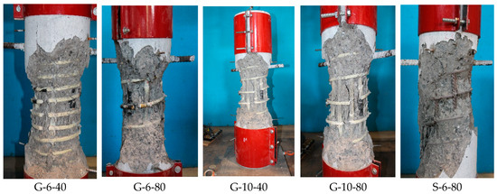 According to Table 2, a higher reinforcement ratio resulted in an 11 to 18% increase in strength. However, it cannot be definitively concluded that the enhanced strength was solely due to the longitudinal GFRP reinforcement ratio. This is because the spirals also played a crucial role in enhancing the strength of the GFRP–RC columns, providing effective confinement for the concrete core in columns G-10-80 and G-10-40, as illustrated in Figure 11.