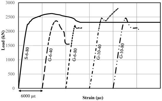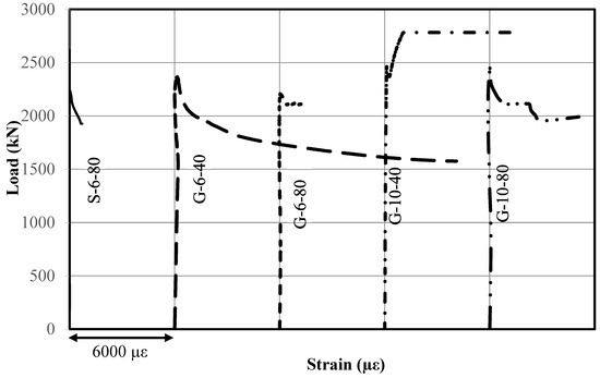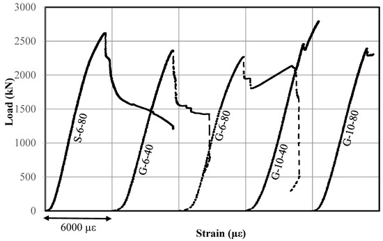 Table 3 gives an overview of the experimental findings for the axially loaded short columns. The axial strain in the longitudinal and spiral reinforcements, as well as the maximum load and corresponding concrete strain, was noted. Figure 5 shows the cracking conduct of a typical GFRP–RC column at different loading stages. All columns’ cracking conduct during the failure stage is depicted in Figure 6. Both the GFRP–RC and steel–RC columns at first behaved similarly. As the load increased, vertical microcracks gradually became more numerous and wider, beginning to appear at about 80–90% of the maximum loads. Each GFRP–RC column could withstand a maximum axial load of between 2207 and 2797 kN; higher loads were due to better confinement and higher axial rigidity. The steel–RC column (S-6-80) had a load of 2621 kN, which was 19% greater than the counterpart GFRP–RC column’s load (G-6-80).