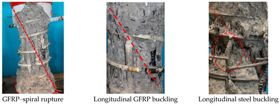 Figure 9 shows the bending and rupture of the longitudinal bars in the failure zone, as well as the rupture of both the GFRP and steel spirals. The diagonal failure plane is indicated in this figure by the dashed line and circle. These findings imply that GFRP bars differ from steel bars in their failure modes, and further investigation is needed to fully comprehend the conduct of GFRP–RC short columns.