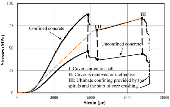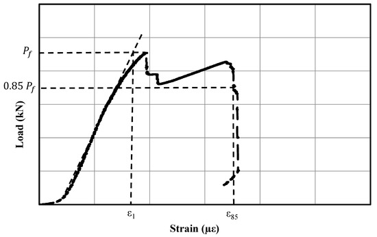 Figure 10 compares the axial load–strain curves of the short columns. All columns’ axial strain values were calculated after measuring the axial deflections of the columns using LVDTs, and the data were gathered using a data acquisition system. At up to 80 to 90% of their peak loads, all columns initially behaved similarly and showed nearly linear load–strain behavior in the ascending part. Depending on how the test parameters affected the concrete core’s ability to contain the peak load, there were variations in the axial strain and corresponding peak load. According to Table 2, confinement increased the concrete core’s strength, which is shown by the ratio f/cc/f/co, where f/cc stands for the strength of the confined concrete and f/co for the compressive strength of the unconfined concrete. The stress–strain curve, showcased in Figure 11 as an example for column G-6-80, provides insights into the column’s performance under confinement and was used to calculate f/cc and f/co. Initially, the strain generated within the column was negligible or non-linear, attributed to the preservation of its entire cross-sectional area and the absence of cracks that could influence its behavior. As the column experienced crack initiation, it exhibited an approximately linear response up to the first peak load. The upper curve in the graph represents the confined concrete area defined by the centerline of the outer tie, while the lower curve corresponds to the total load divided by the total concrete cross-sectional area. The dashed colored curve in the middle (Path 0-I-II-III) depicts the concrete column’s actual response, which was predicted to be a blend of the two calculated curves. The table displays the ductility of the concrete as the ratio , where is the axial strain defined at an axial load equivalent to 85% of the peak load () in the descending part of the load–strain curve (see Figure 12) and is defined at a strain equivalent to the limit of elastic behavior on the ascending part. Once more, the initial non-linear behavior or low strain depicted in Figure 13 can be attributed to the intact cross-section’s resistance to the applied load.