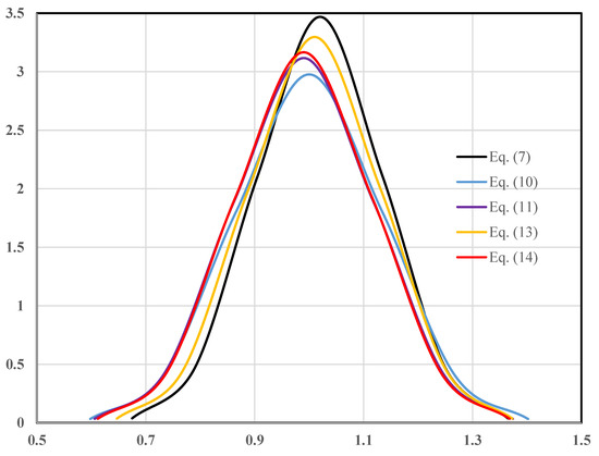To validate the results and ensure the accuracy of Equation (7), a rigorous evaluation was conducted, which involved collecting 42 columns’ data from the existing literature. These columns served as the basis for the comparison against the following proposed equations put forth by other researchers in the field. It is important to note that none of the proposed equations that follow considers the confining effect of the spiral shear reinforcement.