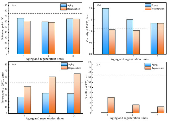 Effect of aging–regeneration cycles on (a) softening point, (b) viscosity, (c) penetration, and (d) ductility of SMB, where the dotted lines represent the values of unaged SMB.
