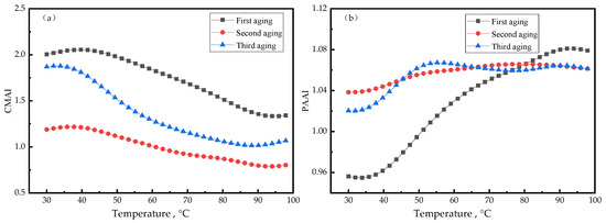 Figure 3 reflects the effect of cyclic aging–regeneration on the deterioration degree of SMB through the CMAI and PAAI indices. Figure 3a shows that the CMAI index gradually decreases with an increase in aging time. It can be found that the CMAI curve for the second aging is obviously lower than that for the first aging within the whole range, while the third aging curve is between them. In the scanning temperature range above 40 °C, the CMAI index of SMB increases slowly with increasing temperature, which implies that the SMB sample is more susceptible to aging under 40 °C. Based on the CMAI index, it can be concluded that SMB loses its elasticity after the second and third aging because the restorable degree of SBS in SMB is limited and decreases rapidly with an increase in the aging–regeneration cycle, resulting in the loss of elasticity conferred by the SBS, and this also illustrates the limited recovery of the aged SMB.