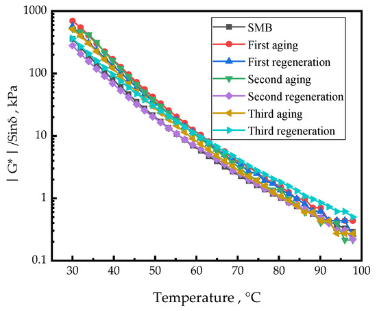 The rutting factors of SMB before and after aging–regeneration are determined by the temperature-scanning experiments to evaluate the high temperature performance of SMB. Figure 4 shows the rutting factors of SMB with different aging–regeneration cycles. The rutting factor of regenerated SMB decreases with the increase in the aging–regeneration cycles, which indicates that the high-temperature deformation resistance of SMB is improved compared with the original SMB in the first few regeneration events. This is because the regeneration process of SMB cannot avoid aging in the thermal and oxygen environment, which causes SMB to become hardened and brittle, and although the high-temperature deformation resistance of SMB improves at this time, the ductility of SMB deteriorates and SMB is prone to cracking at low temperatures.