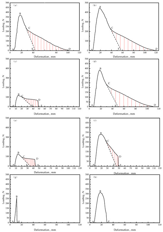 Effect of different aging and regeneration times on the toughness and tenacity of (a) virgin bitumen, (b) SMB, (c) first aging, (d) first regeneration, (e) second aging, (f) second regeneration, (g) third aging, and (h) third regeneration, where the area of the shadowed part represents the value of tenacity and the area of the whole graph represents the value of toughness.