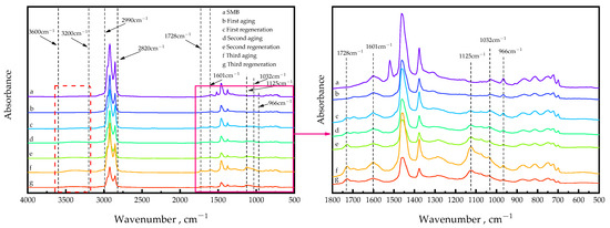 The infrared spectra of SMB after different aging–regeneration cycles are shown in Figure 6, and the relevant main characteristic absorption peaks are shown in Table 5. In order to quantitatively analyze the oxygen-containing functional groups in bitumen, the carbonyl index (IC=O) and the sulphoxide index (IS=O) were defined using Equations (3), (4), and (5), respectively.
