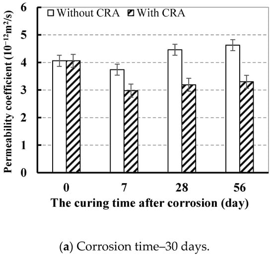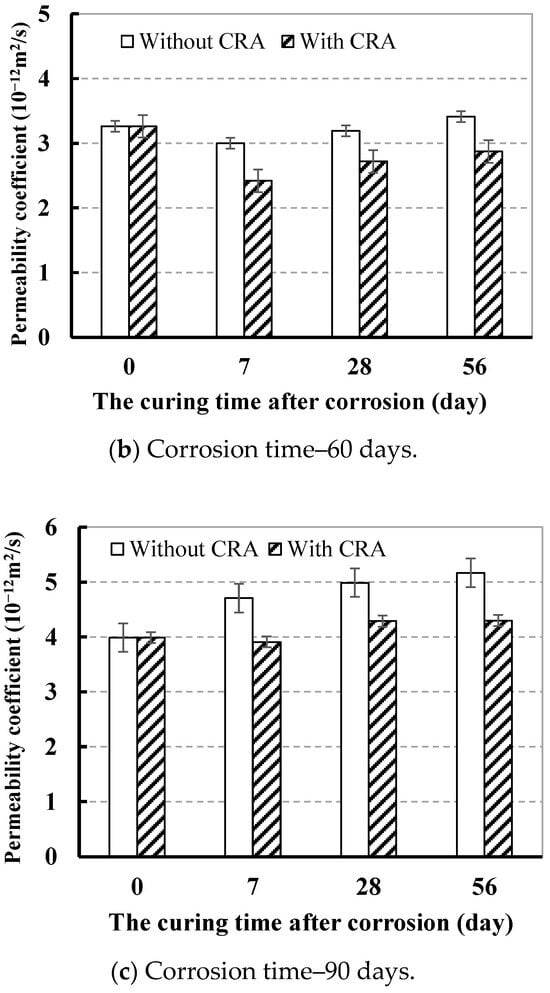 - The relative chloride ion permeation coefficient of concrete with CRA decreased by 14.0% more than that of the concrete without CRA.