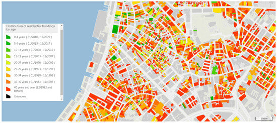 Distribution of residential buildings by age in the Historic Centre of Macao, the legend is on the left. (image source: Macau Statistical Geographic Information System).