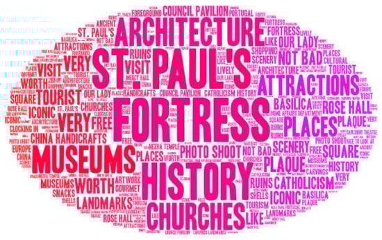 Conversely, the Macau SAR government’s current urban planning and development objectives center on enhancing tourist capacity, establishing Macau as a global tourism and leisure hub, and cultivating deeper integration between tourism and other industries [,]. Therefore, analyzing tourist destination images from the perspective of large tourist groups holds significant practical implications. It offers valuable insights for addressing current shortcomings in Macau’s tourism industry reception capacity, affecting the development of Macau’s urban tourism development, and guiding future urban planning.