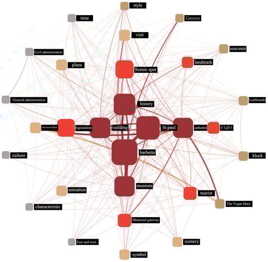 A semantic analysis of network text data, facilitated by ROST CM 6.0 software, allowed for the extraction of semantic relationships and features in the dataset, resulting in a co-occurrence network of high-frequency terms (Figure 9). In this network diagram, lines connecting various points radiate outwards to form unique hierarchical characteristics. Disregarding the term “Macau”, the first core layer consists of “Ruins of St. Paul’s”, “museum”, “fortress”, and “architecture”, directly representing the tourist image of the Historic Centre of Macao and indicating that historical architectural heritage holds significant interest for visitors. As the sub-core layer, the second layer expands upon the core layer with terms such as “culture”, “worthy”, “spectacular”, and “symbol”, suggesting that architectural cultural heritage possesses unique value and generates positive perceptions and emotions in tourists experiencing the Historic Centre of Macao. The third layer, or sub-peripheral layer, offers further depth to the core and sub-core layers through two vocabulary categories. The first comprises locations such as “Rose Hall”, “St. Paul’s”, and the “Civic and Municipal Affairs Bureau”; the second reflects tourists’ experiential feelings, including terms such as “convenient”, “distinctive”, “lively”, and “style”. Vocabulary in the peripheral layer primarily exhibits co-occurrence with core layer vocabulary, with weaker connections to other layers. This outermost layer expands upon the content of the core and sub-core layers, and over time, its vocabulary will likely establish stronger connections with the core, finally becoming the focal point of the tourist image of the Historic Centre of Macao.