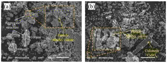 - Promotion of cement hydration: Compared to the S2 group without SR, XRD tests of the S5 and S15 groups with added SR revealed the presence of AFt and AFm hydration products in SRCLS. C3A in cement hydrated the fastest, reacting with water to form 4CaO·Al2O3·13H2O (C4AH13) [38] in pure water. The SR contained a small amount of CaSO4·2H2O. In the SRCLS system, the hydration product of C3A is ettringite (AFt) [39]. The reaction equations are given by Equations (3) and (4).When CaSO4·2H2O is exhausted in the system, AFm is formed from the reaction between C4AH13 and AFt, as shown in Equation (5). Both AFt and AFm possess stronger cementitious properties than C-S(A)-H, wrapping around soil particle surfaces, enhancing internal compactness, and increasing the material strength.