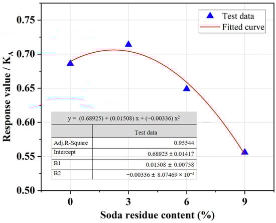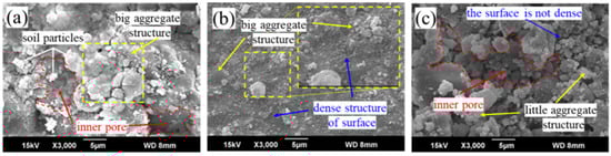 - Partial lime substitution effect: The main component of lime is Ca(OH)2, which reacts with active substances in soil. Similarly, SR contains a significant amount of Ca(OH)2 and has an alkaline nature. Its addition, it increases the alkaline environment of the mixture, further promoting the leaching of active silicon and aluminum ions from the soil [37]. Active SiO2 and Al2O3 in the soil react with Ca(OH)2 in soda residue to produce calcium silicate hydrate (C-S-H) and calcium aluminate hydrate (C-A-H) that partially substitute for lime, as represented by Equations (1) to (2). These cementitious substances bind soil particles together, forming larger aggregates, filling particle voids, thus improving the density and strength of the cement–lime–soil.