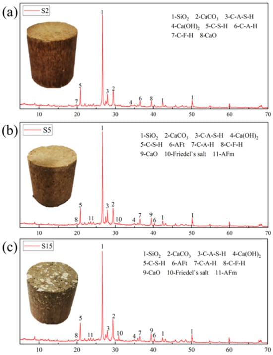 - Chloride ion binding: XRD tests of the S5 and S15 groups revealed the presence of Friedel’s salt in SRCLS. This was attributed to the dissolution of CaCl2 and NaCl from SR, which then combines with the unhydrated C3A and AFt in the system. The former combination involves Cl− directly reacting with C3A to form hydrated calcium chloride containing chlorine (Friedel’s salt) [40], while the latter involves Cl− substituting for the sulfate ions of AFt to form Friedel’s salt [41]. These reactions are represented by Equations (6)–(8).