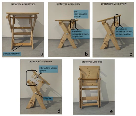 In the development of our second prototype (Figure 2), our objective was to integrate a tiltable tabletop, height adjustability, pendulum footrest, foldability and the use of natural materials. The inclination of the tabletop is managed by a four-level system, enabling an inclination from 0° to 20° by pulling the handle in and out of the pin (Figure 2b,c). The desk can be folded by unlocking the tabletop from the front desk legs, with the legs folding over the axis at their intersection (Figure 2d,e). The prototype is made of spruce. We failed to combine foldability and height adjustment.