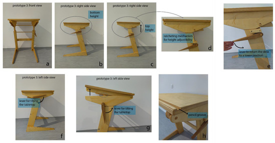 The tabletop inclination is continuously adjustable from 0° to 10° by a lever on the left side of the desk (Figure 3f,g). The tabletop adheres to the standard SIST EN 1729:2016, with a depth of at least 500 mm and a width of at least 600 mm. A pencil groove on the lower edge prevents pencils from falling off the desk (Figure 3h). Constructed from plywood, our third prototype was designed with the intent to positively impact physiological indicators and overall well-being and at the same time to be light enough to move.