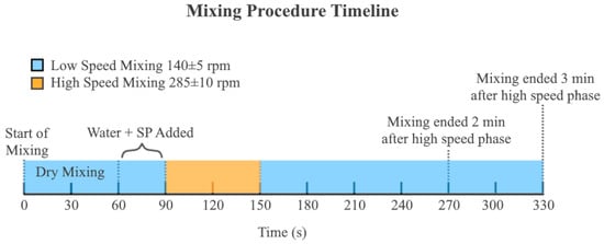 Mixing was conducted in an ELE International mixer, compliant with I.S. EN 196-1 []. CEM, GGBS, sand, and clay (if present) were dry mixed first at 140 ± 5 rpm for 60 s. Prior to mixing, water and SP are combined. Following dry mixing, the water-SP mixture was added to the mixer using a funnel for over 30 s. The wet mix was then mixed at 285 ± 10 rpm for 1 min and finally at 140 ± 5 rpm for 2 to 3 min, depending on the apparent consistency of the mix. Figure 1 below shows the mixer with dry constituents, and Figure 2 illustrates the steps for the mixing procedure.
