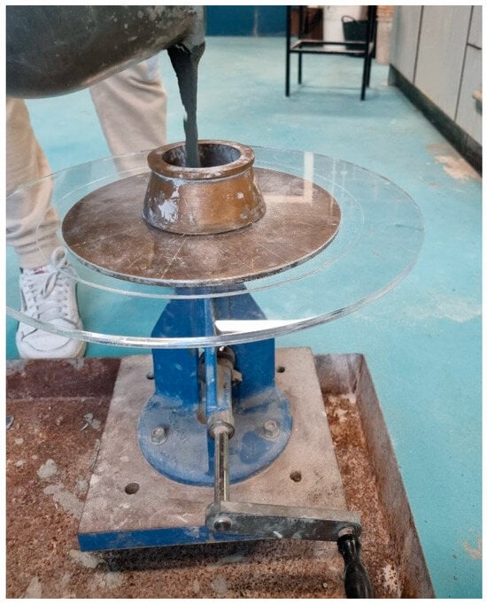 A sample of each mix was filled in a slump-flow apparatus to test its consistency. For this test, a slum-flow table and mold in line with ASTM C230 were used []. The slump-flow apparatus was adapted with a Perspex table to accommodate the wider flow diameter of the mixes, as shown below in Figure 3. In the test, the mold was fully filled without tamping. Compaction was deemed unnecessary during trial mixes due to the high flowability of the mixes. The mold was scraped level, and any excess concrete was cleaned off the table. The mold was immediately removed, and any concrete remaining on the mold was allowed to drip onto the sample. The diameter of the resulting undisturbed mortar flow was recorded in two perpendicular directions. The average was taken as the slump-flow result. During trial mixes, it was deemed unnecessary to use the table’s striking mechanism to agitate the samples, given the high flowability seen in the samples.