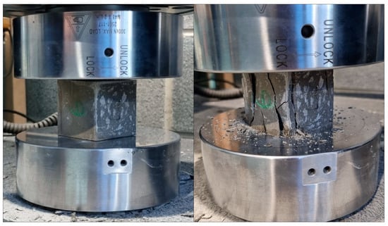 To test the compressive strength of each mix, 50 mm cubic samples were prepared by filling molds of the same size with concrete from each batch. These molds were coated with de-molding oil prior to being filled. Upon being filled, mixes were deemed flowable enough that no vibration was necessary. The specimens were wrapped with plastic sheeting in order to retain moisture and allowed to set. The specimens were removed from their molds the following day and placed in a water tank, maintained at 20 °C until they reached their designated testing age. Three samples were tested after 28 days. Specimens were placed into an Instron 6800 series universal testing machine and subjected to uniaxial unconfined compression at a constant rate of 2 mm/min until failure. Figure 4 below shows a specimen before and after testing. The compressive strength (MPa) of each specimen is determined using Equation (4) below where Ff denotes the compressive load at failure (N) and Ac (mm2) denotes the cross-sectional area subjected to loading. The result is considered the average strength of the three specimens crushed at each testing age.