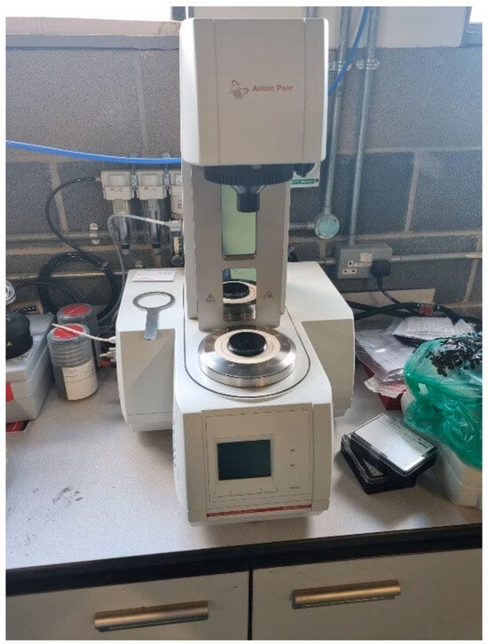 Determination of the rheological properties of concrete mixes was carried out using an Anton Paar MCR 102e SmartPave, shown in Figure 5 below. Immediately upon the completion of the mixing process, the bowl was unloaded from the mixer, and the mix was poured into an Anton Paar Building Material Cell 90 (BMC) and loaded into the rheometer. The BMC was filled to a volume that reached 50 mm below the top surface. The BMC features a ribbed interior surface to prevent wall slip and has an interior diameter of 70 mm and depth of 100 mm. A construction material stirrer was used to perform shearing on the sample. The geometries of the stirrer and BMC are shown in Figure 6 below. The stirrer was positioned 5 mm from the bottom surface of the BMC to prevent blockages due to the max particle size of the mixes being 2 mm. The rheometer heating plate was maintained at 20 °C throughout all tests, and upon beginning the rheological testing, the temperature was allowed to reach equilibrium over 1 min.