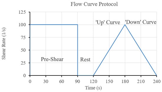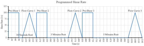 The stress–strain rate results of a hysteresis loop protocol highlight any thixotropy within the material tested. As the shear rate rises, so too does shear stress, as per Equation (1), while simultaneously, as the shear rate rises and persists over time, the structuration within the sample is disrupted, and viscosity is decreased. This reduces the stress required to generate the shear rate. Consequentially, the rate of de-flocculation and increasing shear rate compete to decrease and increase the stress required for the imposed shear rate. Whichever of these factors dominates will determine if the shear rate-stress relationship will be positive or negative during the up phase of the shear rate loading. The sample has been de-flocculated to its greatest extent upon reaching the peak shear rate. The stresses measured during the down phase of the shear rate loading will thus be lower than those recorded at the same shear rate during the up phase. The resulting difference between the results of the up and down curves has been used to measure the thixotropy of a material. This test, however, reveals nothing of the thixotropic strength recovery characteristics of a material at rest. This controlled shear rate protocol was carried out three times on each sample. The proceeding test began immediately upon the end of the flow curve test. The protocol was varied by increasing the rest period between the pre-shear and flow curve phases. The 30 s rest period was increased to 3 min and 5 min for tests that followed. By making each sample undergo pre-shearing and resting for longer periods of time, the thixotropic strength recovery of each sample can be observed by comparing the yield stress during each flow curve. The full protocol is shown below in Figure 8.