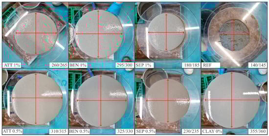 Figure 9 shows the slump-flow results for each mix, and results are also tabulated in Table 5 below. All mixes were highly flowable except for REF. This is in line with the expected effect of GGBS substitution on cement-based materials to increase workability []. In the past, the slump-flow diameter has been used as an estimator for printability, as it has been seen that the static yield stress is related to the max diameter of flow []. At all times within the sample, the stress at the bottom is proportional to the mass of the material above. This stress is typically greater than the static yield stress of the sample, and thus, as the mold is removed, flow occurs. Upon spreading, the mass of material above any point diminishes, and flow is expected to stop once the stress induced by this diminishing mass is less than the dynamic yield stress. For this reason, a small slump-flow diameter represents a mix with high resistance to flow and strong shape retention. The greatest result observed was that of CLAY 0% at 358 mm. In all cases, the addition of clay can decrease the max flow radius from that of CLAY 0%, thus increasing the consistency of the mixes.