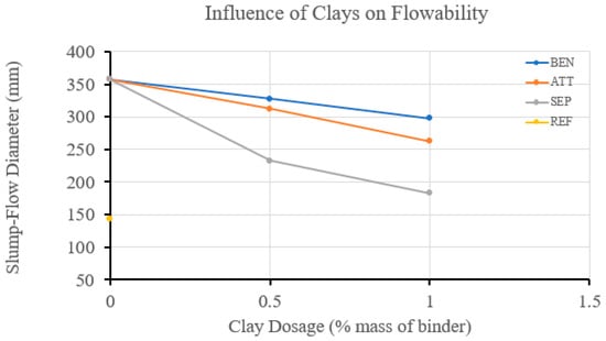 - Slump-flow diameter shows a linear decrease as the dosage of all clays increases, with SEP resulting in a diameter reduction of 2.8 times that of ATT at 0.5% dosage. This decrease is indicative of an improved capacity for shape retention.