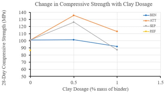 - SEP and ATT both have the capacity to improve the compressive strength of low-carbon mixes by a minimum of 25% and 34%, respectively. There exists a clay dosage between 0 and 1% at which this compressive strength increase is greatest. It is possible this behavior is also applied to BEN.