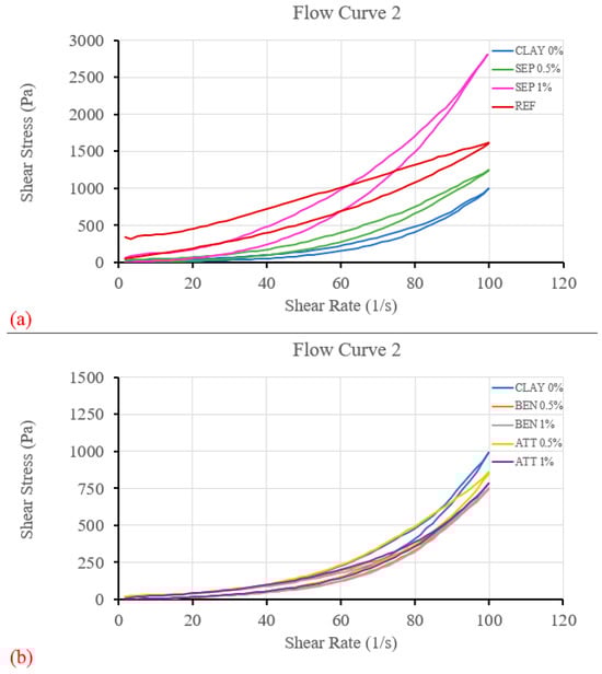 Stress–shear rate curves in flow curve 2: (a) CLAY 0%, SEP 0.5%, SEP 1%, and REF; (b) ATT 0.5%, ATT 1%, BEN 0.5%, BEN 1%, and CLAY 0%.