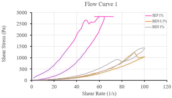 Stress–shear rate curves of SEP 1%, BEN 0.5%, and BEN 1% in flow curve 1.
