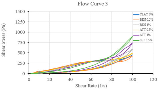 Flow curve 2 was used to illustrate the mixing behavior in Figure 12 as this set of measurements best illustrates the shear thickening behavior within the material. The non-representative response of flow curve 1 has been described, but a different response was also observed in flow curve 3. Figure 14 below illustrates the behavior displayed by BEN 0.5%, BEN 1%, ATT 0.5%, ATT 1%, SEP 0.5%, and CLAY 0% in flow curve 3. During this flow curve for shear rates below approximately 50 (1/s), these mixes exhibit an approximately linear stress–shear rate relationship with an apparent viscosity significantly greater than that displayed during their flow curve 2. This apparent viscosity diminishes gradually once the shear rate passes 50 (1/s), after which point the mixes return to exhibiting shear thickening. This enhanced viscosity is likely due to the early influence of hydration. Flow curve 3 begins 17 min after the rheological test begins, and as the structuration of the mix has been greatly diminished by the end of flow curve 2, the early hydration products would dominate the behavior of these weaker mixes. These mixes, however, all developed smooth curves during the ‘down’ phase.