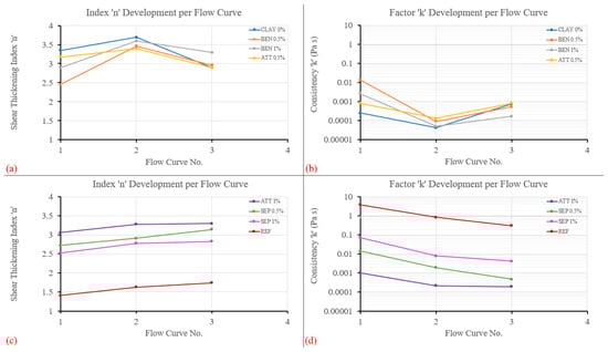 Change in parameters: (a) Change in n between flow curves for mixes CLAY 0%, BEN 0.5%, BEN 1%, and ATT 0.5%; (b) Change in k between flow curves for mixes CLAY 0%, BEN 0.5%, BEN 1%, and ATT 0.5%; (c) Change in n between flow curves for mixes ATT 1%, SEP 0.5%, SEP 1%, and REF; (d) Change in k between flow curves for mixes ATT 1%, SEP 0.5%, SEP 1%, and REF.
