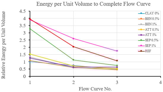 Work per unit volume required for each to complete each full flow curve, relative to that of CLAY 0% flow curve 1.