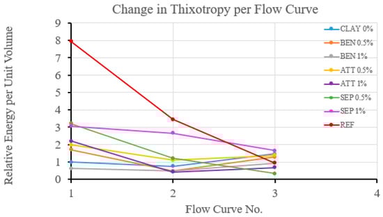 In flow curve measurements, a material’s thixotropy is measured through the area captured between the up and down curves of a stress–shear rate plot []. As a result of some mixes reaching the rheometer’s torque limit during testing, the shape and area of these curves were distorted. The work integral in Equation (6) was instead used to compare thixotropy. The difference in work required between the up phase and down phase of a flow curve was calculated for each curve of each mix. Figure 17 below illustrates the change in this result per consecutive flow curve. It can be seen that for all samples, the thixotropy measured in flow curve 2 is lower than in flow curve 1. The difference in work between the up and down curve is a measure of the de-structuration of the material during shearing. The decrease in work from Flow Curves 1 to 2 indicates that when flow curve 2 begins, the sample is more disturbed than it was before the start of flow curve 1, meaning the pre-shear phase was not able to return the samples to the same level of structuration. This trend continued in flow curve 3 for both mixes containing SEP and for REF, while other mixes noted a rise in thixotropy during this flow curve. As discussed earlier, during this flow curve for shear rates below approximately 50 (1/s), these mixes exhibit an approximately linear stress–shear rate relationship with an apparent viscosity significantly greater than that displayed during their flow curve 2, which diminishes beyond a shear rate of 50 (1/s). This period of greater viscosity results in a greater thixotropy measurement, as once the mixes return to their shear thickening behavior, much lower stresses are generated at low shear rates.
