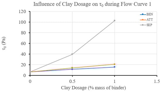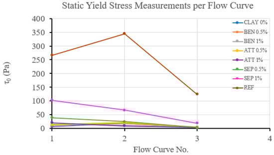 Figure 18 below illustrates the relationship between clay dosage and static yield stress during the first flow curve’s up phase. It can be seen that mixes containing BEN and ATT have a minor positive influence on τ0, while 1% SEP increases it by a factor greater than 5. This result is in line with the slump-flow results observed, and the origin of this effect can be explained similarly. As per Table 8 above, the dynamic yield stress of every mix except for REF was found to be less than 10 Pa, which means these samples had negligible resistance to flow upon the end of shearing.