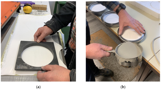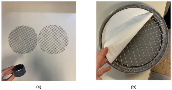 The coating application process (e.g., application method by brush, uniform direction, consistent repaint intervals, etc.) was executed by a skilled laboratory technician and accords with NS-EN 927-10:2019 [43] and the manufacturers’ specifications. The re-paintable intervals between the layers were sufficient to allow proper drying. Each product had a separate brush and stirrer to prevent sample contamination. A Teflon film substrate was used to allow for easy detachment [42]. For each product, a total of twelve specimens were painted, six of which were of three layers and six of which were of six layers, then cured for seven days in freely circulating air, before being punched out to the circular specimens of 0.174 m diameter, see Figure 1. After which, they were stored in the controlled test enclosure for at least 28 days [42] until further cup assembly.