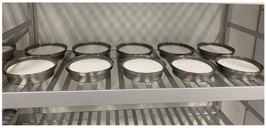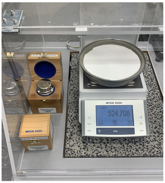The first weighing occurred 24–48 h post-assembly to accommodate the initial stabilization of water vapour transmission. The time interval for the subsequent measurements was then set at 24 h, based on the expected range of the product’s -value, which was between 0.5 and 2 m [29,42]. The weight measurements were carried out using a high-precision balance with an accuracy of 0.001 g, which was placed inside a plastic chamber to prevent disturbances from the surroundings, see Figure 4. The balance was calibrated with a control weight of 1000 g before each individual weighing.