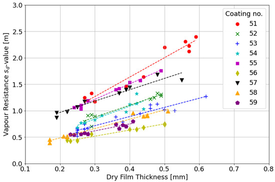 In Figure 5, the linear correlation between the measured dry film thickness and the determined for the nine coatings are shown. For each product, both series (B + B2) are displayed since they represent a greater span of thicknesses for the same coating. The coefficients of determination R2 are provided in Table 7. The high R2 values indicate that 81 to 98% of the variance in the -value can be explained by the dry film thickness, suggesting a strong linear relationship for all the coatings. Higher dry film thickness generally results in a greater resistance against vapour diffusion.