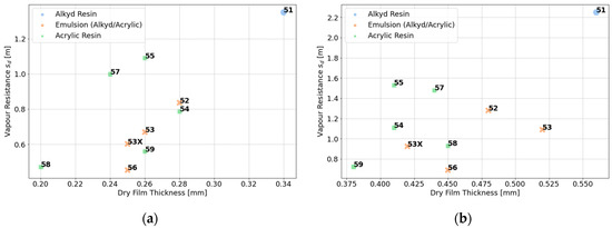The measured values in Table 6 suggest a relationship between the binder type and the vapour resistance of the coatings, as depicted in Figure 6 below. The alkyd coating no. 51 exhibited the higher vapour resistance compared to emulsions and acrylics; this is assessed further in the later discussion. However, the difference between the acrylics and the emulsions seems to be negligible in terms of the -value.