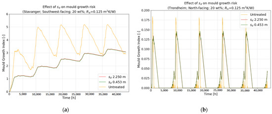 The effect of the coating’s vapour resistance on the development of mould growth index of (a) Fjogstad-Hus, Stavanger, and (b) ZEB-Laboratory. The extremal -values of 2.25 m and 0.453 m, and displayed together with the untreated. Note the different scale of the the y-axis.