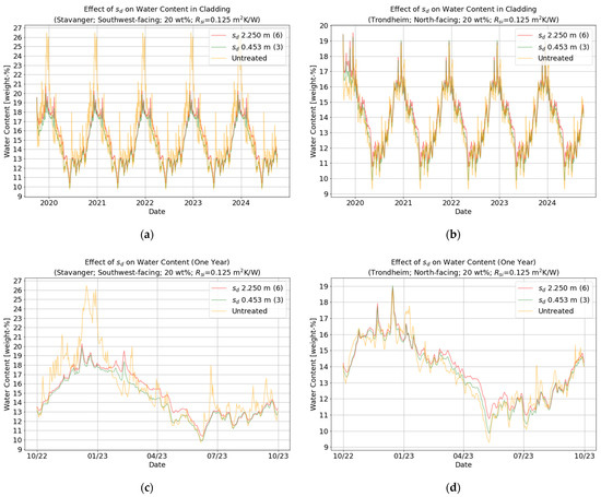 The effect of the coating’s -value (absolute max and min) on the moisture conditions of the cladding. Here, “(6)” and “(3)” in the data labels signify six and three layers of coating, respectively. (a) Five-year period of Fjogstad-Hus, (b) five-year period of ZEB-Laboratory, (c) one-year period of Fjogstad-Hus, and (d) one-year period of ZEB-Laboratory.
