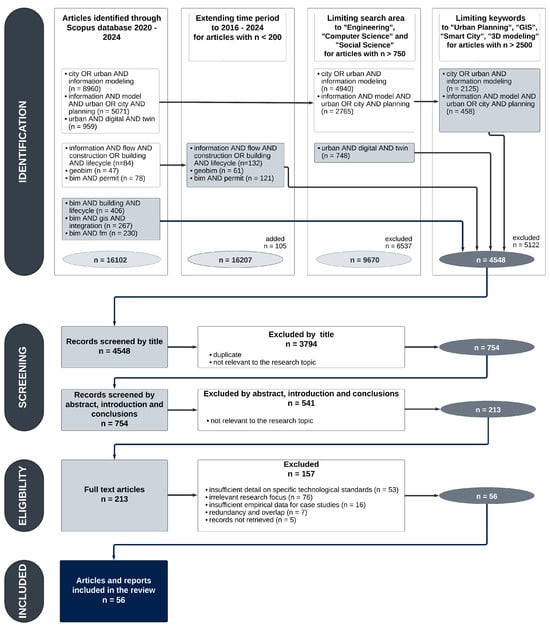 To address the identified problem, an imperative literature review was conducted, examining the expansive topic of information flow and the lifecycle within the construction and urban planning sectors. Using carefully selected keywords explained in Figure 1, searches were performed using the PRISMA method (Preferred Reporting Items for Systematic reviews and Meta-Analyses) [], focusing on titles, abstracts, and keywords.