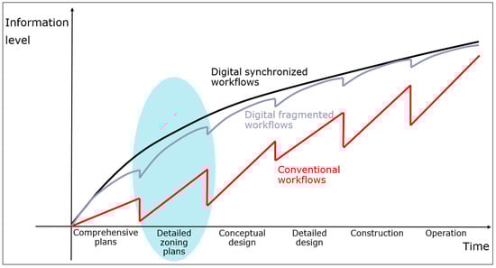 The diagram highlights the critical transition points (ovals in light blue) between comprehensive plans, detailed zoning plans, and conceptual design, indicating a significant area where traditional workflows experience information loss and digital workflows have not yet been widely implemented. Consequently, the focus of future research centers on detailed zoning plans.